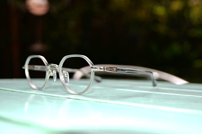 掛け心地のよさを高める機能がデザインとなったヒンジが艶々のシルバーで存在感を放ちます。ややゆったりとした独特のクラウンパントだけでも目を引きますが、テンプル(ツルの部分)に配したグレー系のクリア生地のお陰で、本来なら隠れている中の芯までしっかり見て取ることができるのはcol.7カラーならではのお楽しみです。インナーリムの配色といい何とも端正なモデルです。