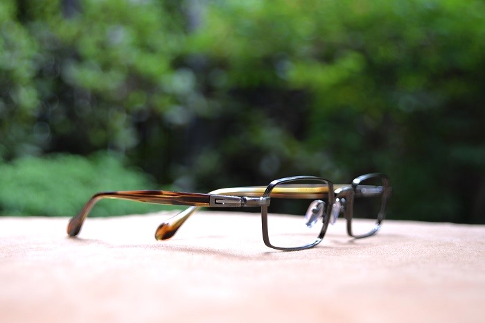 レンズを囲む枠に奥行きを持たせて何本もの線を刻んだレコードリムから、機能美が杉本圭らしいヒンジ、そして柔らかくも深みを感じるモダン(ツルの部分)へと振り向き様に流れるような美しさが続きます。