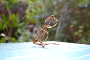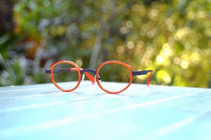 複雑な描線や多色使いのデザインにも面白さがありますが、こちらは2色使いで素材も2つだけ。ひとつずつに注目すると至ってシンプルですが、パッと目を引く眼鏡はBEAUSOLEILの真骨頂な気がしています。ユニークそうでいてさらりと日常使いできる所以です。お色味違いでだいぶニュアンスが変わるところもこのモデルの魅力ですが、こちらはブラッドオレンジを思わせるビターでジューシーなオレンジ色とパープル。寒さのなかにも裏庭でぜひ自然光でご覧いただけますように。