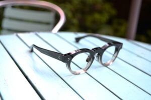アセテート素材(綿花由来のプラスチック)のインナーリムをまだら模様のクリア生地にすることで、ベースのピーコックグリーンが暖色のなかにチラリ。何とも小気味よいカラーリングです。例えば今日の1本もそうですがBEAUSOLEILを眺めていると、”はみださない遊び心”、そんな言葉が浮かびます。