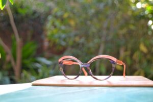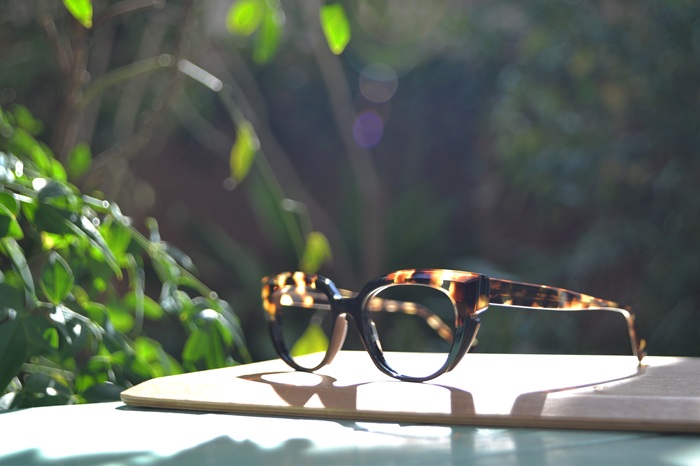 ブロウ部分とテンプル(眼鏡全体で見たときの上半分)に配された いわゆる”べっ甲柄” と、下半分の艶めくブラックは何と言っても王道の配色で、さすがの魅力をたたえています。その上、べっ甲柄の柄行きはと言うとなかなかにワイルド。大きめの斑入りの生地がデザインのイメージにピタリと合った1本です。