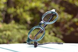 テンプル(つる位置)はやや上寄りで、お鼻周りのレンズシェイプはかなり「ハ」の字になっているなど、全体でシャープさを表現している貴重なモデルです。